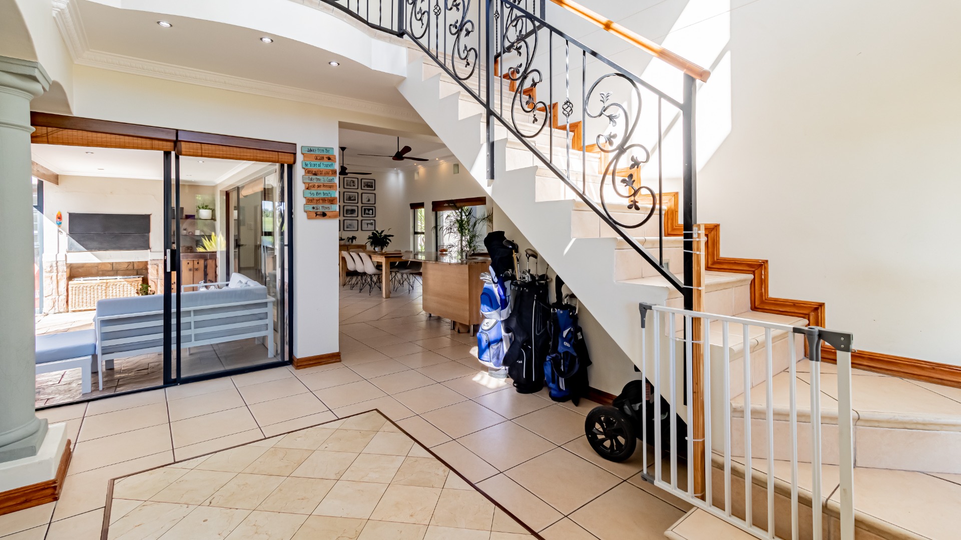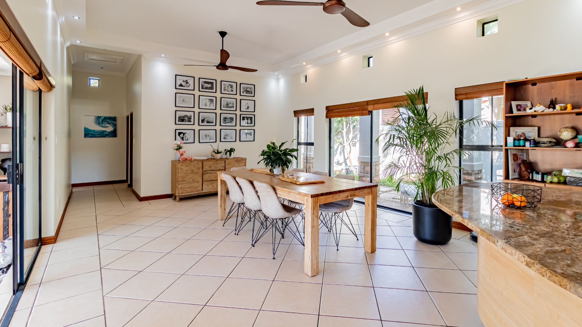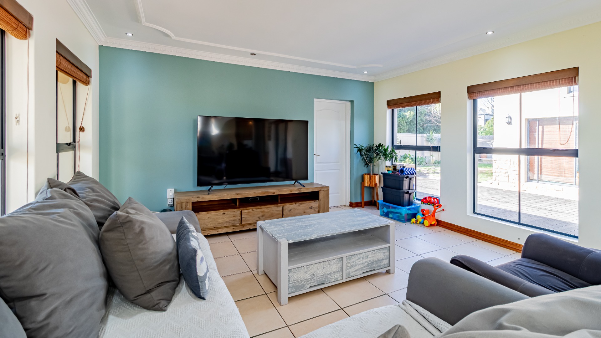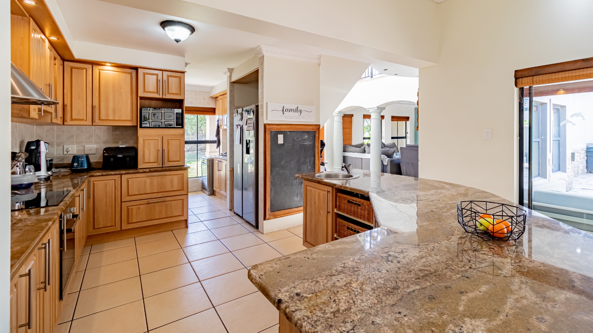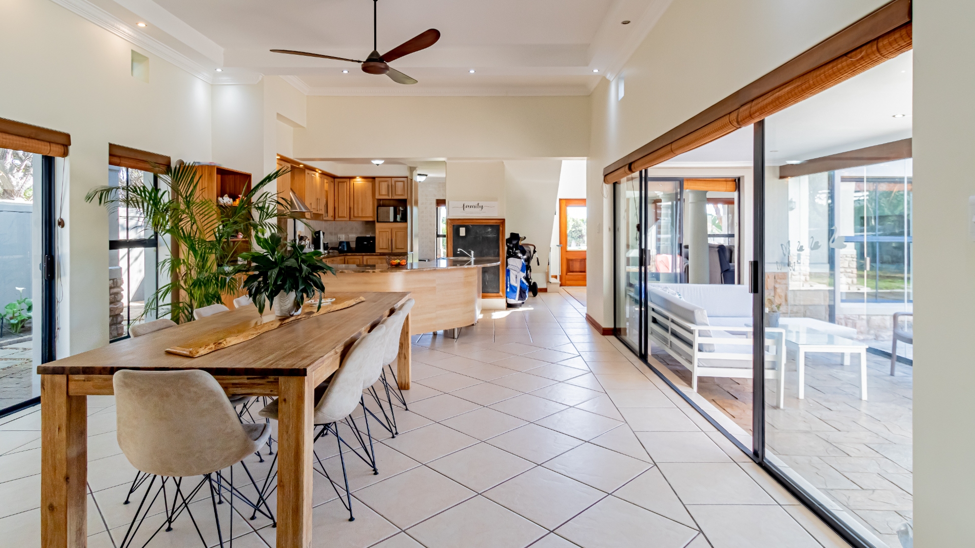 The living areas off the kitchen is lovely and open plan. The kitchen is spacious with lots of built in cupboards as well as a separate scullery. Space for a double door fridge. The leads to the indoor braai room that has stack away doors to the outside pool and garden. The garden is North Facing and wind-free.