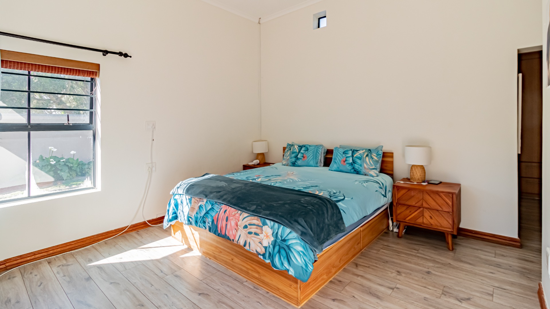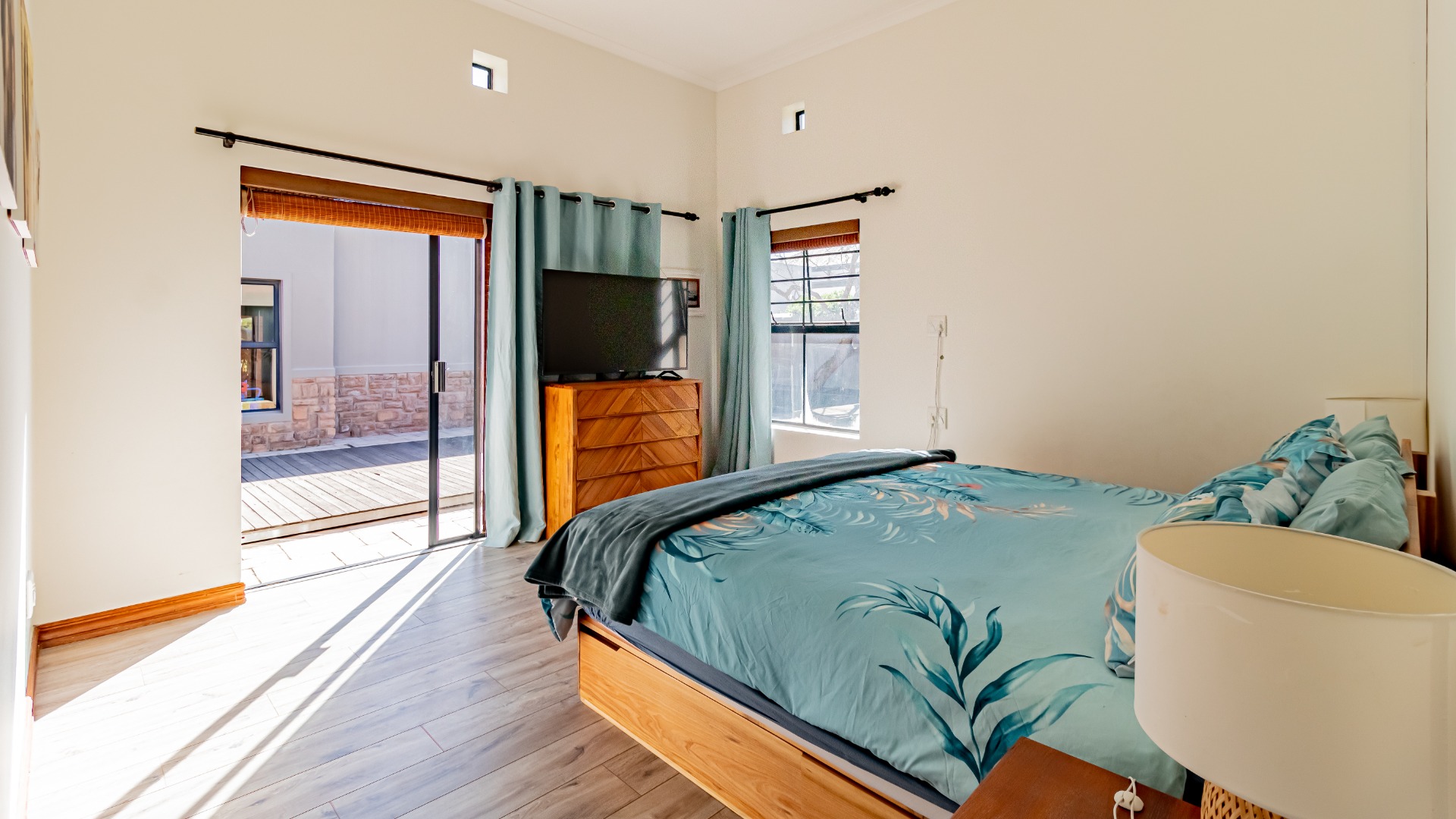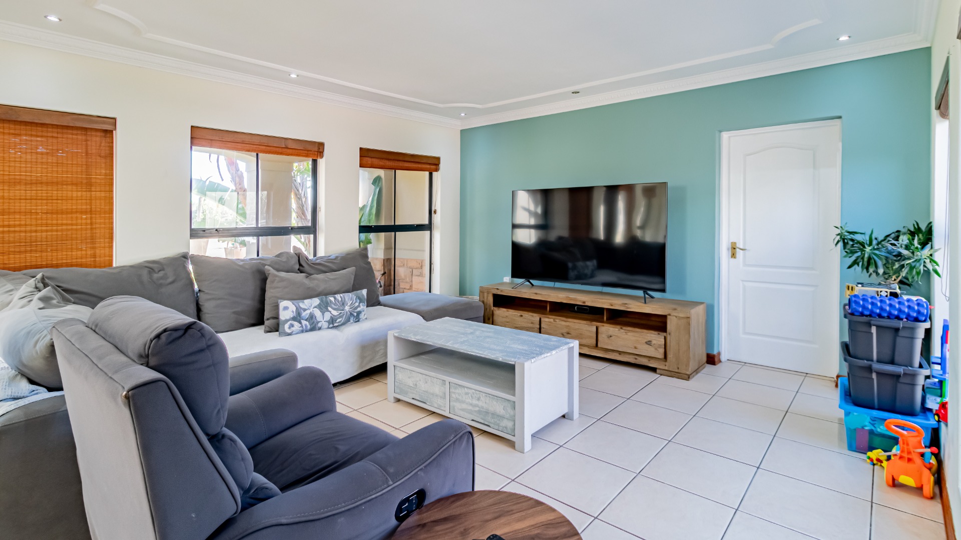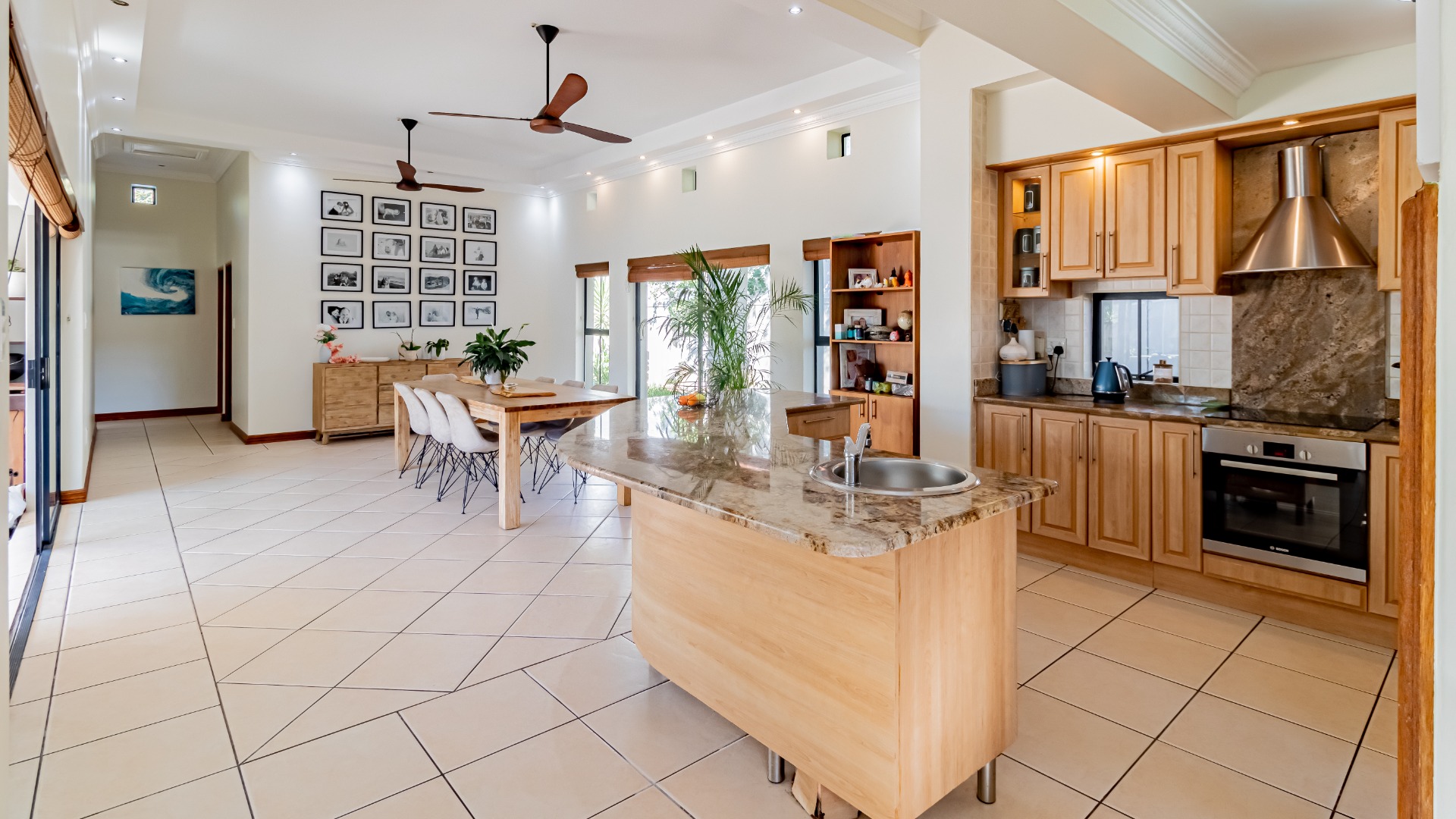 The living areas off the kitchen is lovely and open plan. The kitchen is spacious with lots of built in cupboards as well as a separate scullery. Space for a double door fridge. The leads to the indoor braai room that has stack away doors to the outside pool and garden. The garden is North Facing and wind-free.
