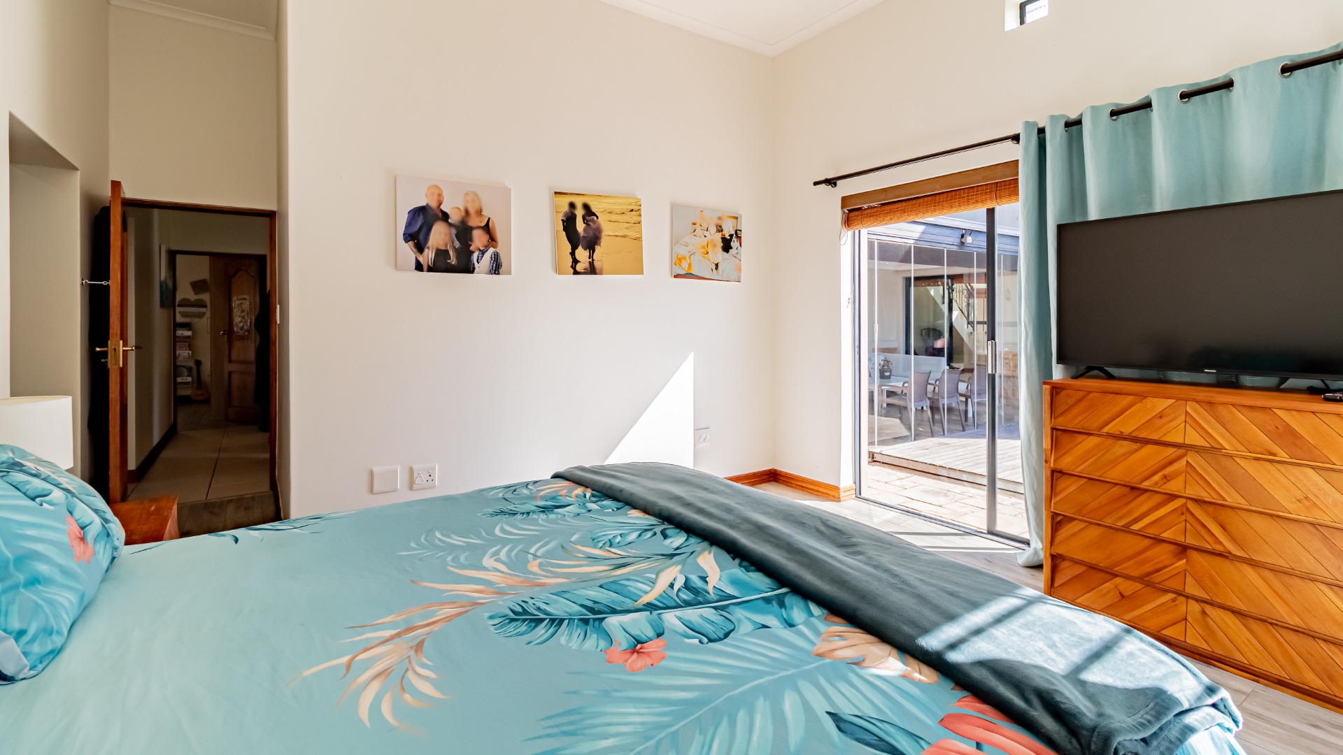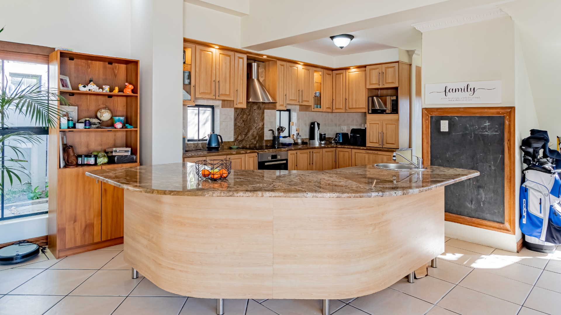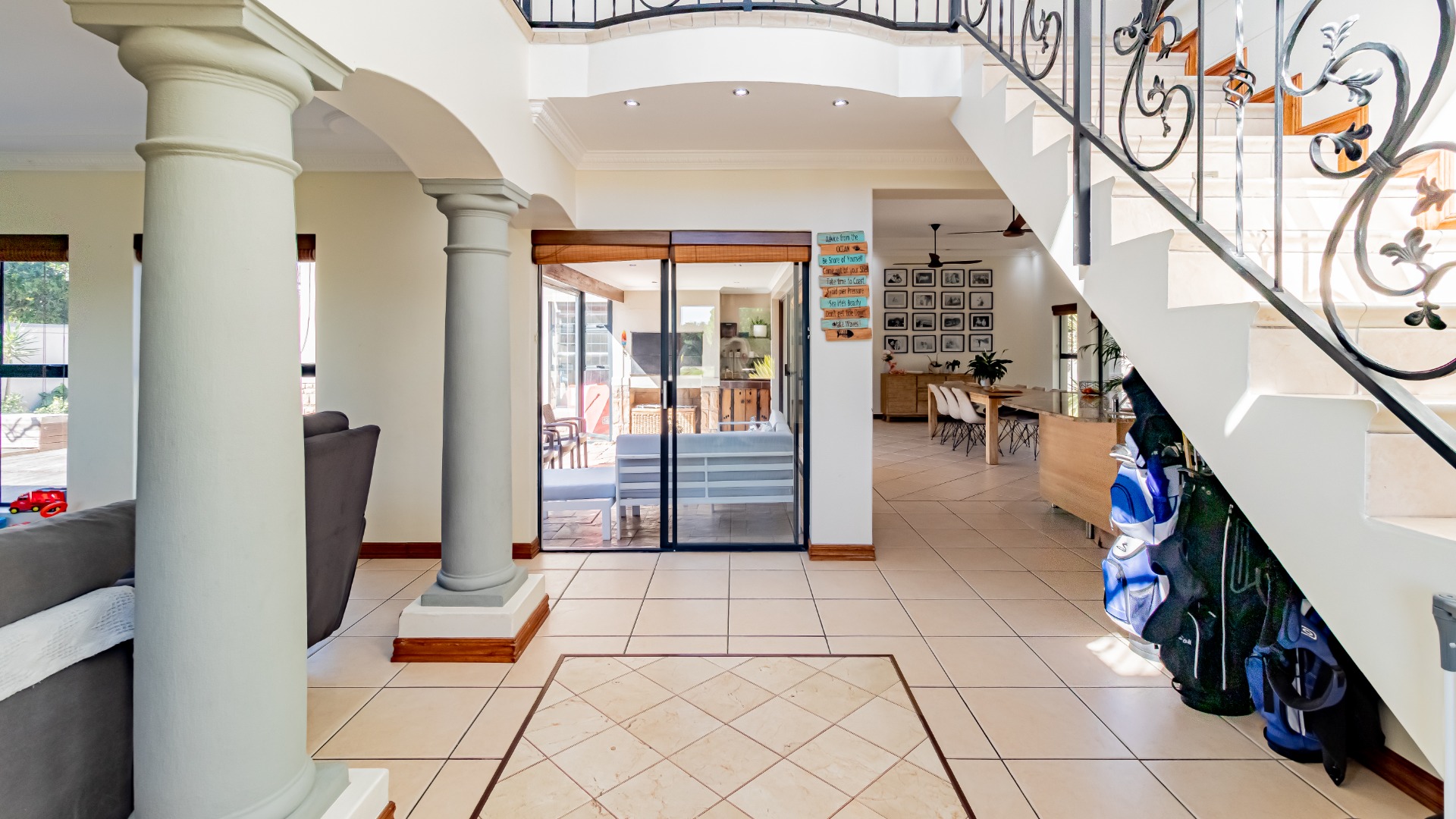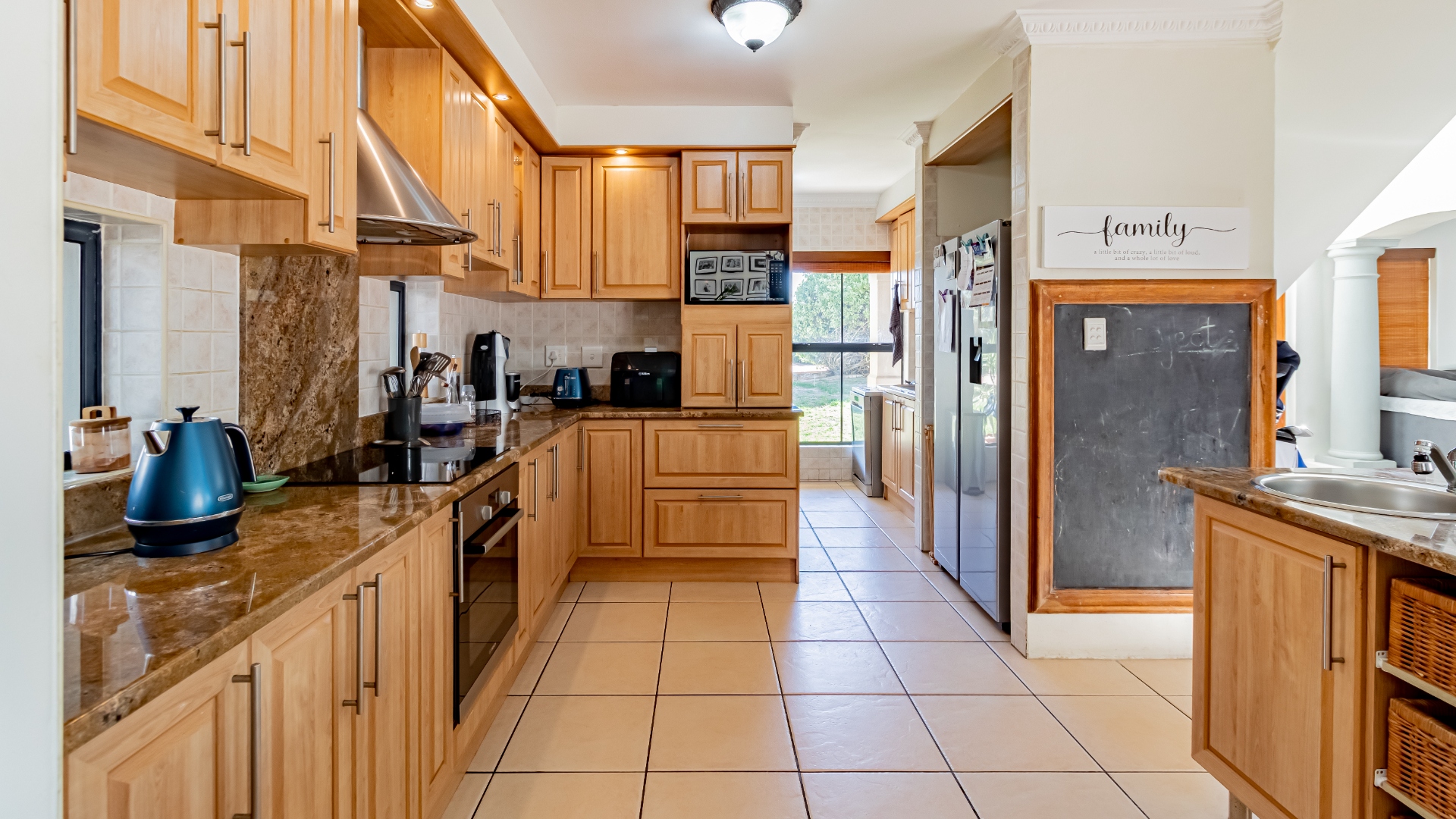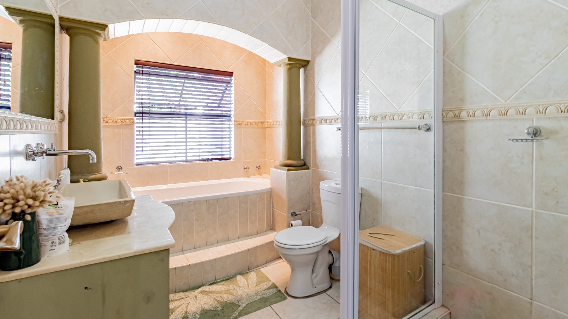 The living areas off the kitchen is lovely and open plan. The kitchen is spacious with lots of built in cupboards as well as a separate scullery. Space for a double door fridge. The leads to the indoor braai room that has stack away doors to the outside pool and garden. The garden is North Facing and wind-free.