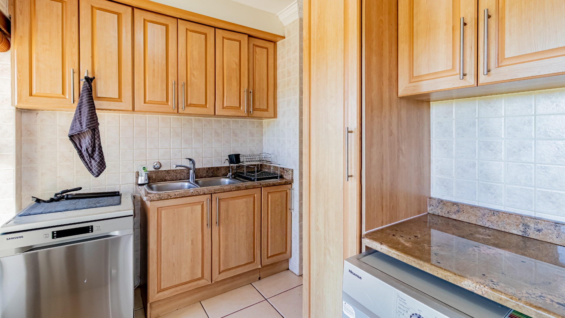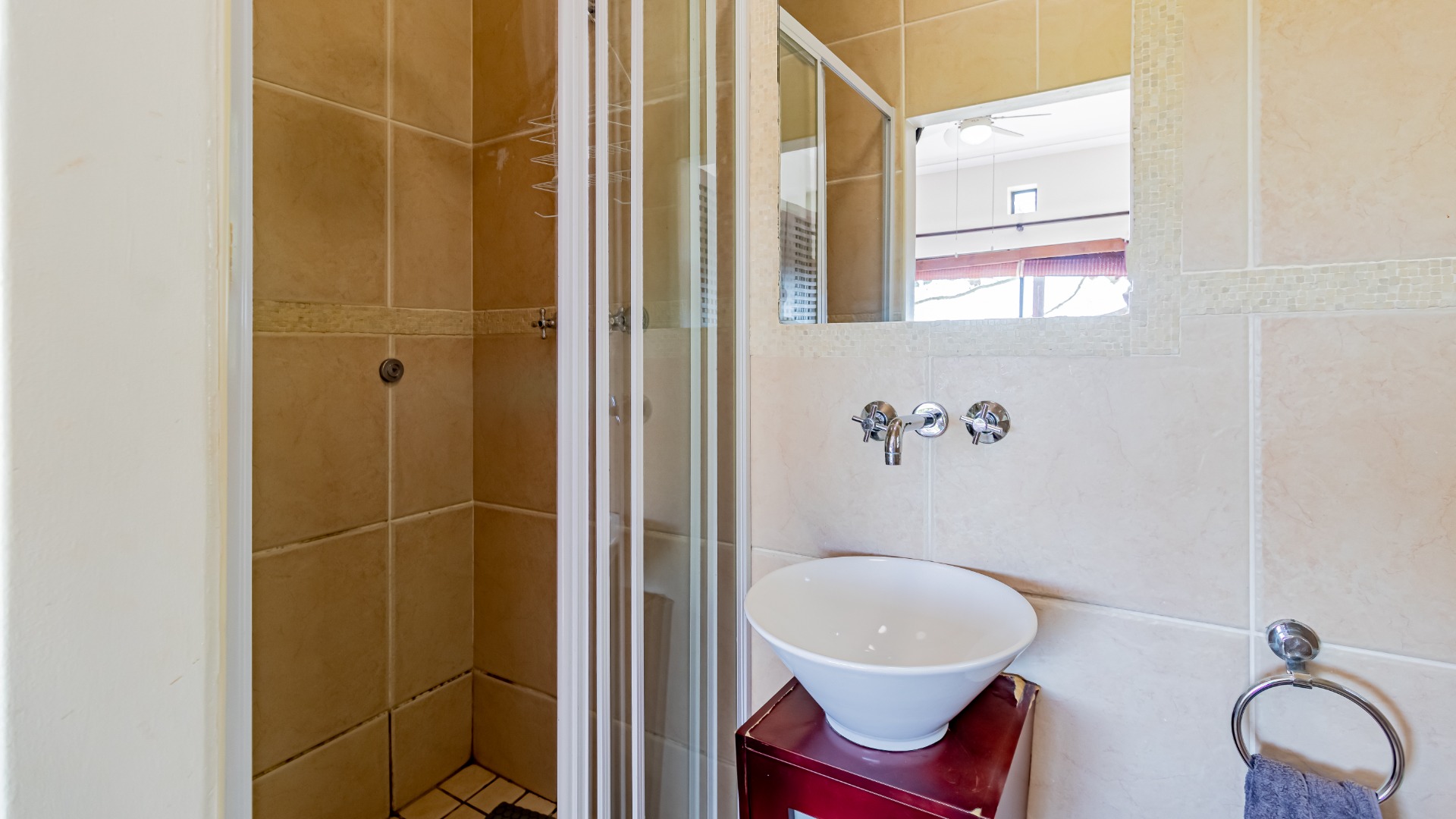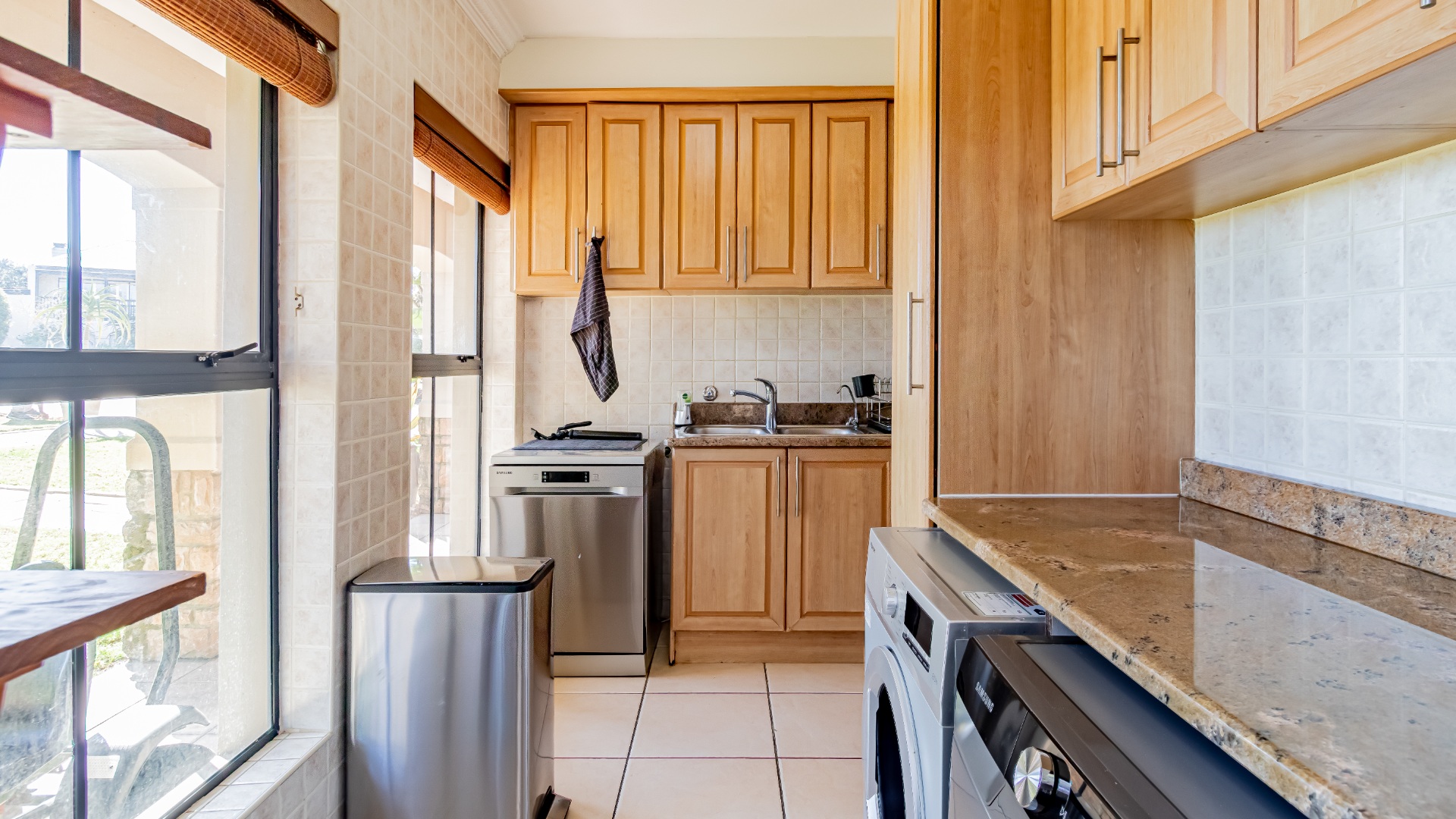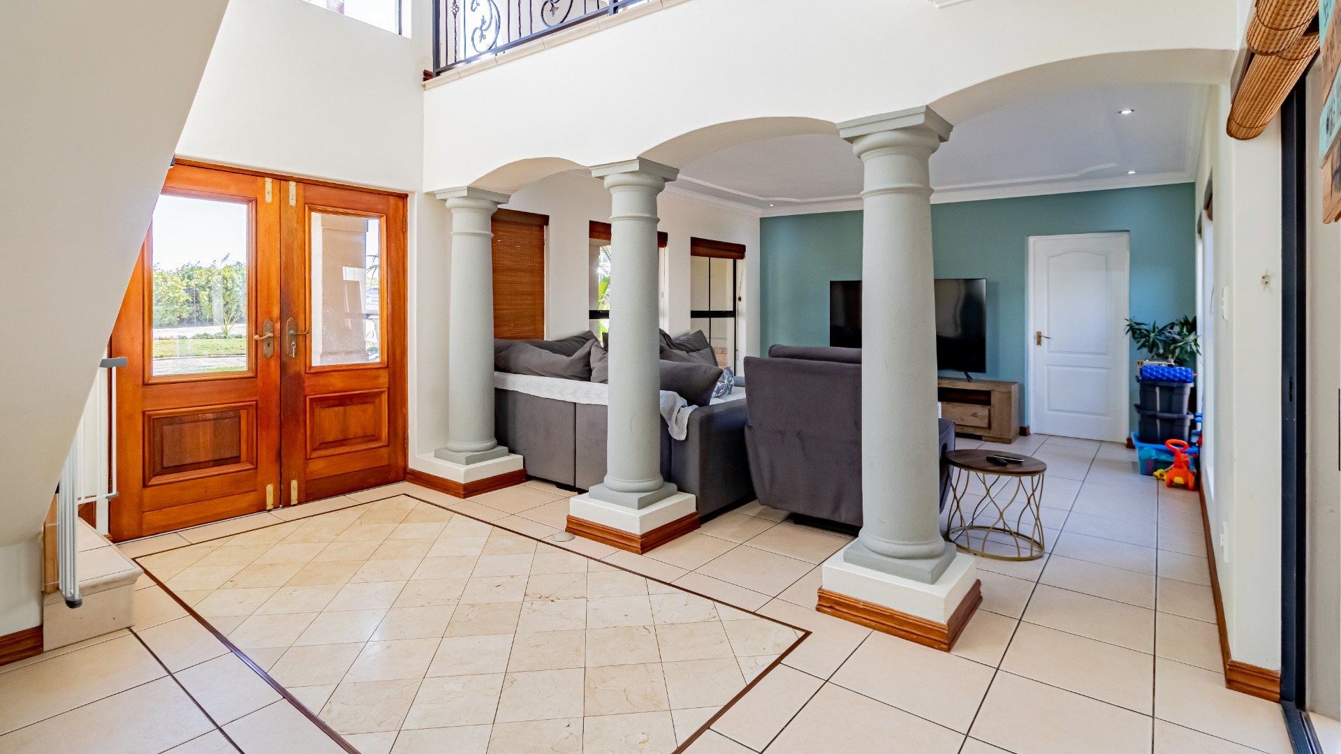 The living areas off the kitchen is lovely and open plan. The kitchen is spacious with lots of built in cupboards as well as a separate scullery. Space for a double door fridge. The leads to the indoor braai room that has stack away doors to the outside pool and garden. The garden is North Facing and wind-free.