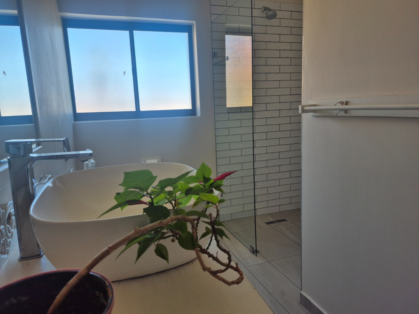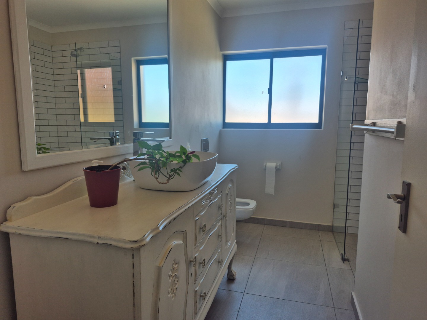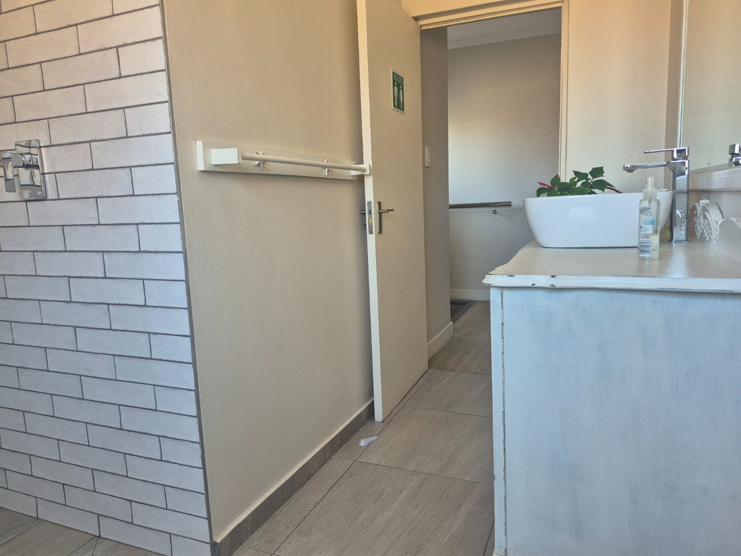 This modern 2-bedroom, 2-bathroom apartment in Melkbosstrand Central offers comfortable coastal living. The property features an open-plan layout, seamlessly connecting the living spaces. The well-appointed kitchen flows into a spacious lounge, designed for both relaxation and entertaining. Large glass doors lead to a private balcony, providing ample natural light and distant ocean views, as seen from the modern railing and tiled floor. Shutter blinds offer privacy and light control, enhancing the living experience.