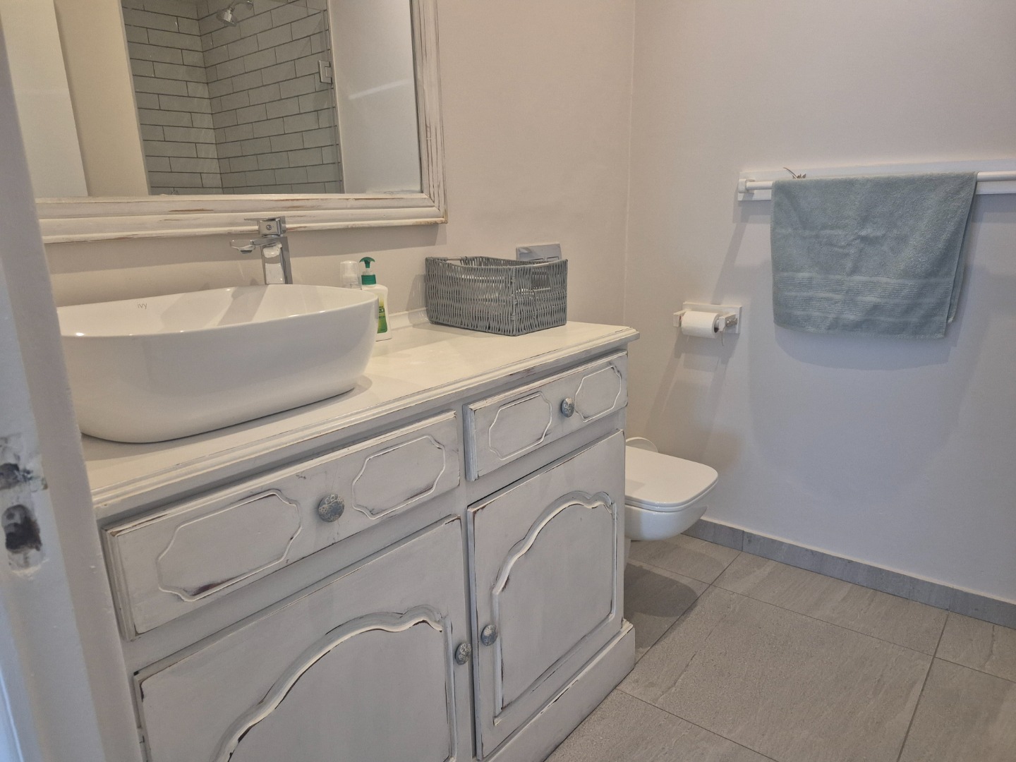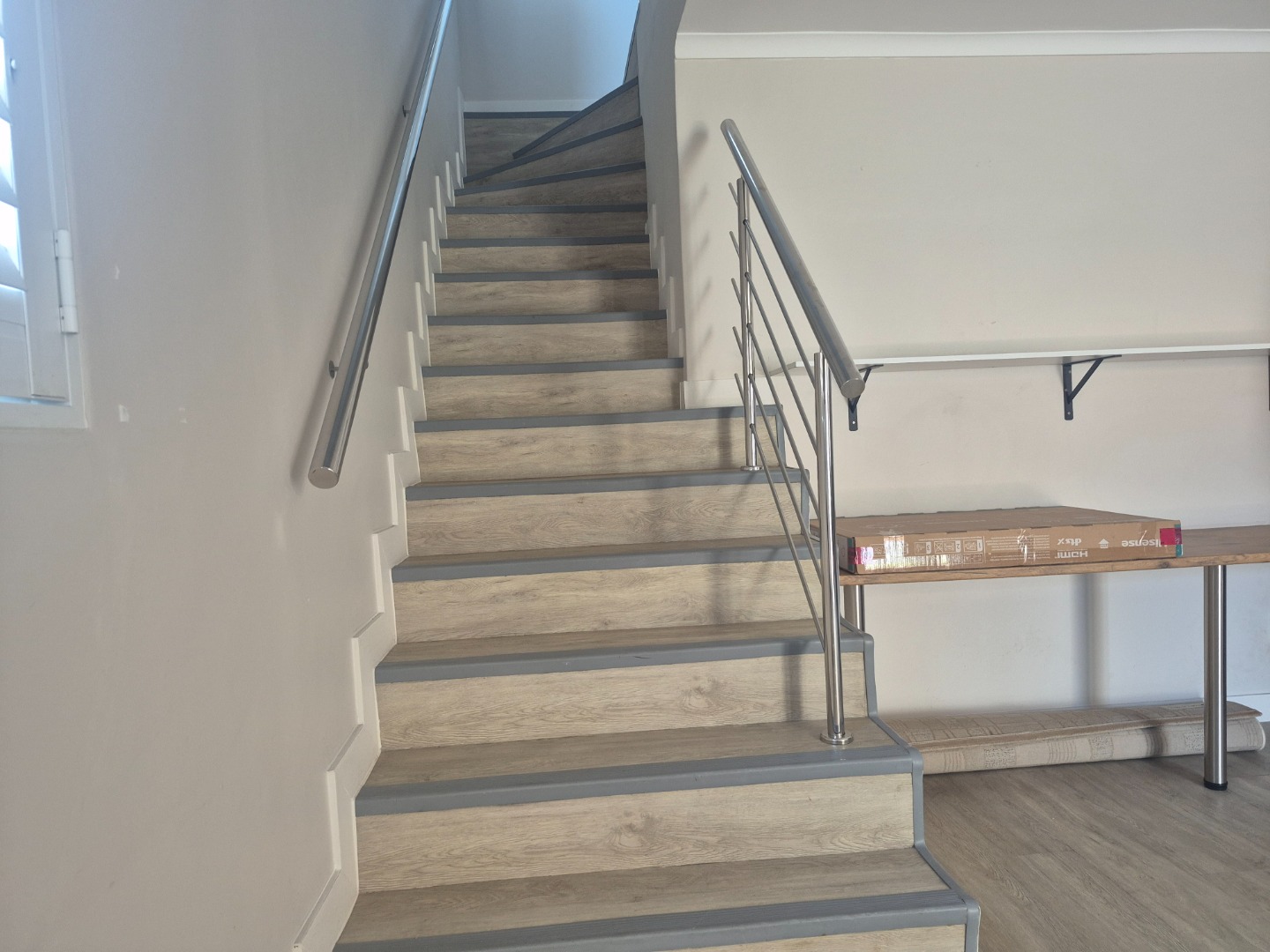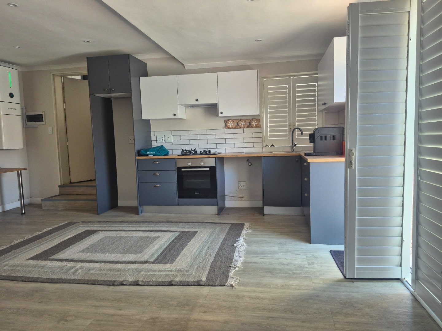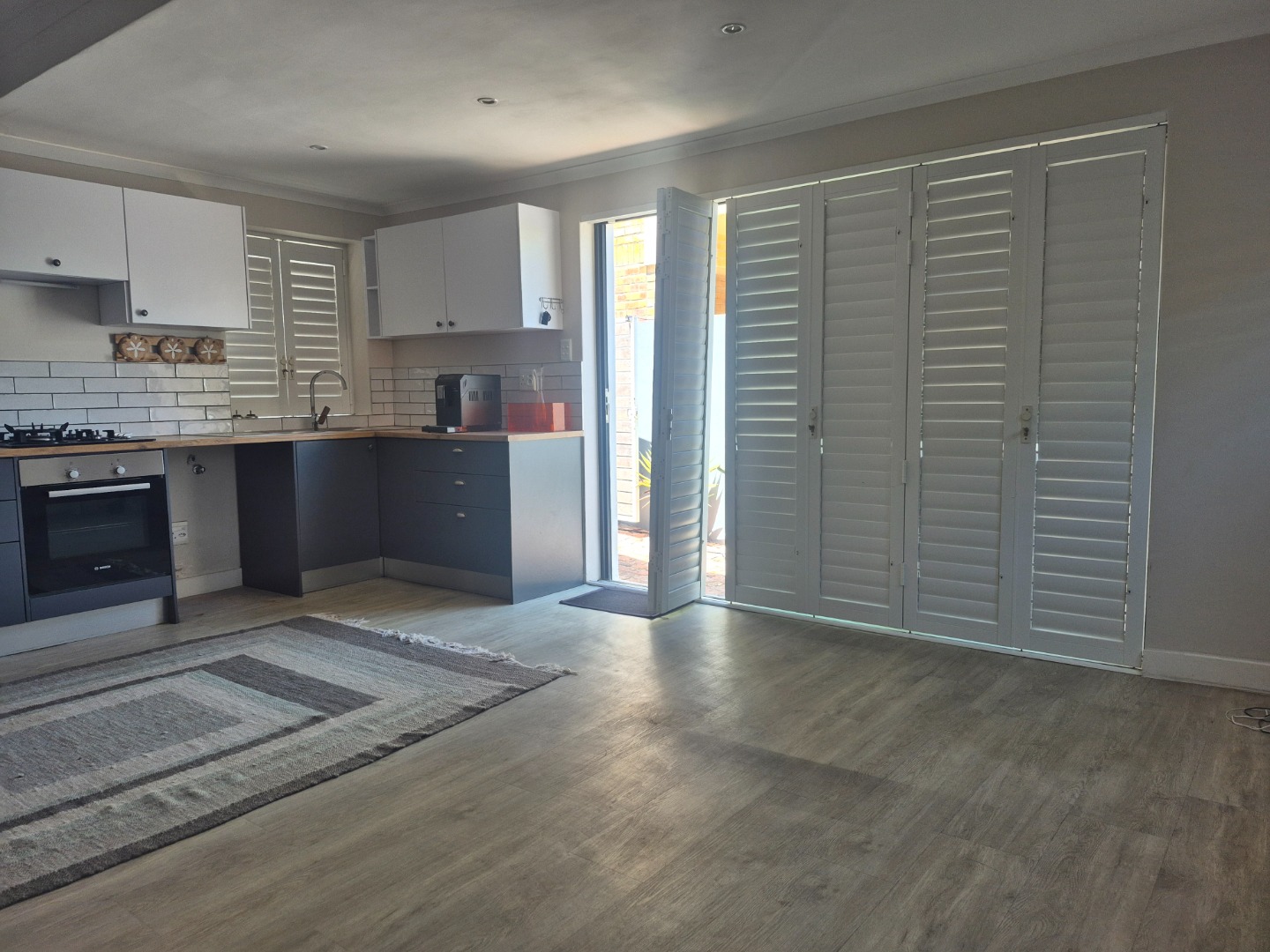 This modern 2-bedroom, 2-bathroom apartment in Melkbosstrand Central offers comfortable coastal living. The property features an open-plan layout, seamlessly connecting the living spaces. The well-appointed kitchen flows into a spacious lounge, designed for both relaxation and entertaining. Large glass doors lead to a private balcony, providing ample natural light and distant ocean views, as seen from the modern railing and tiled floor. Shutter blinds offer privacy and light control, enhancing the living experience.