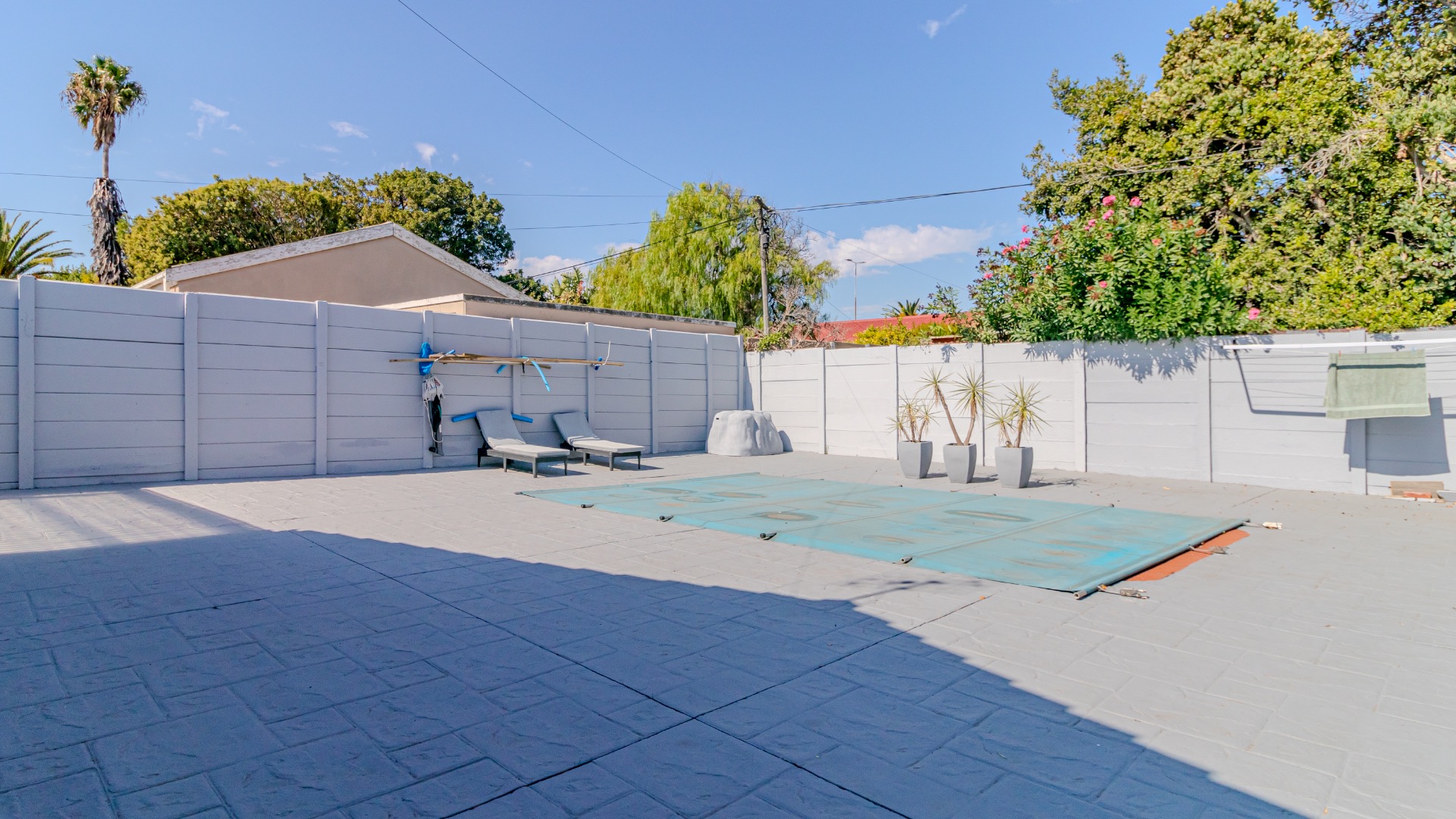 There are three bedrooms, all with built-in cupboards. The main bedroom has its own en-suite bathroom and opens directly to the backyard and swimming pool area. The other two bedrooms share a second bathroom, which has also been tastefully updated.