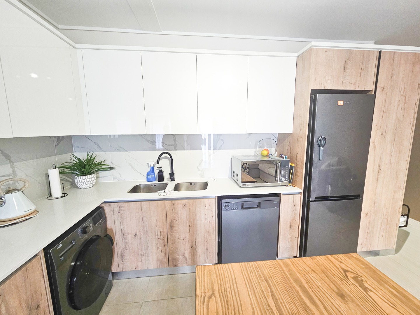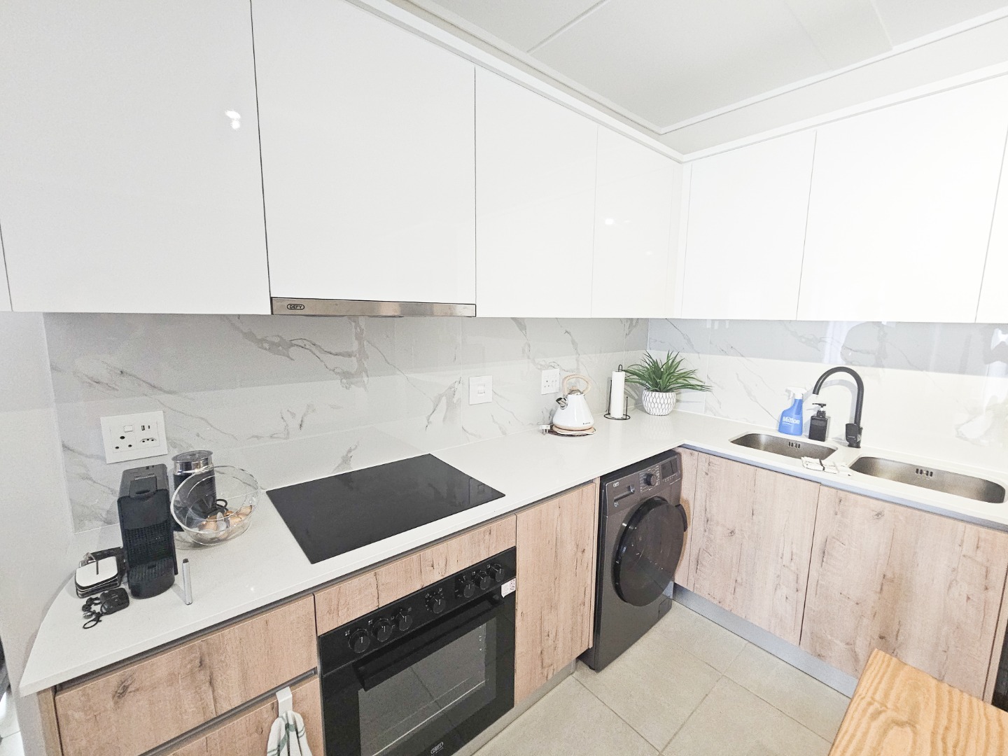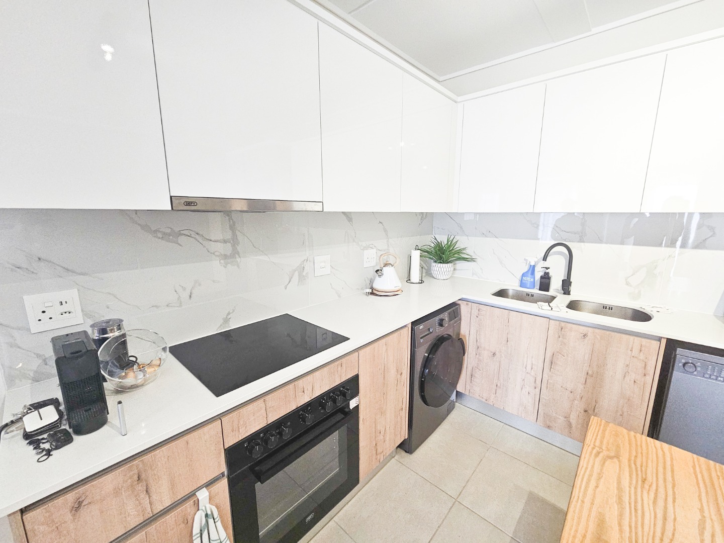 The unit offers an open-plan living area leading to a balcony, a modern kitchen with Quartz tops, and eco-friendly appliances (fridge, dishwasher, washer/dryer).